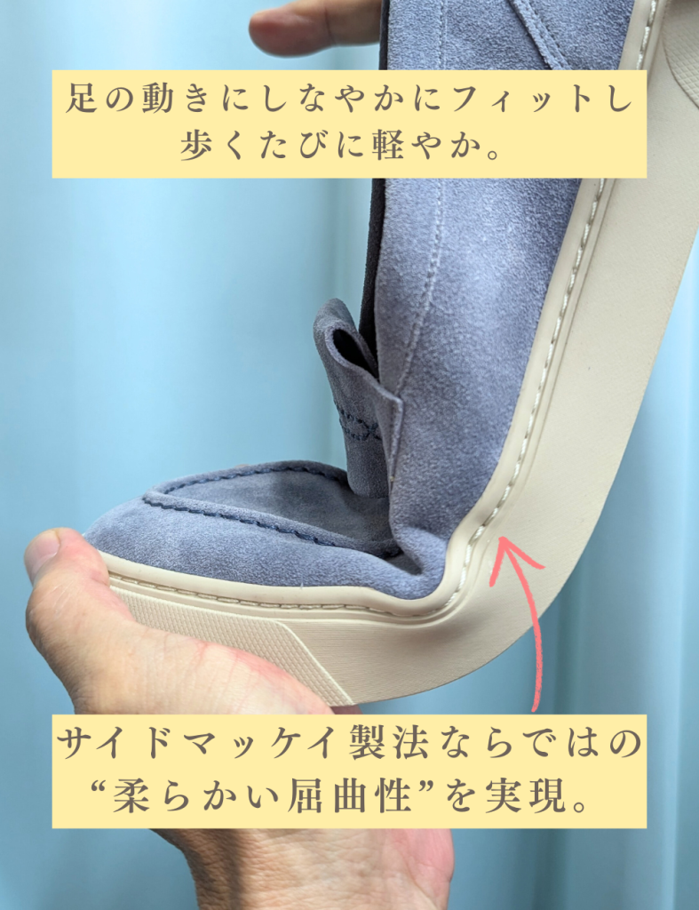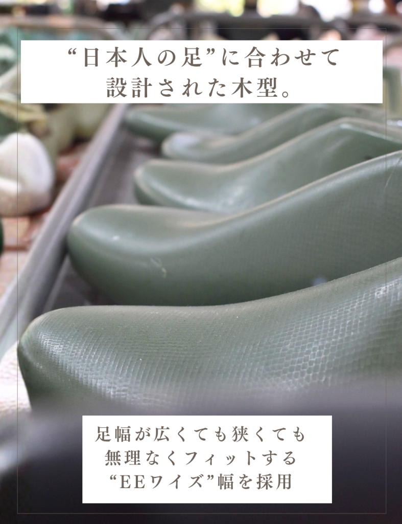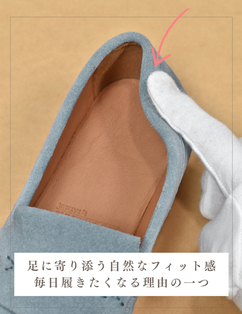 つま先から甲、そして踏まずからヒールにかけて優しく足をホールドする安定したフィット感を達成。そして細すぎず丸過ぎないバランスの良い外観に加え、リラックスしたフィット感で履いても抜けにくい小ぶりの設計にしている為、踵が小さめの方にもおススメの木型です。