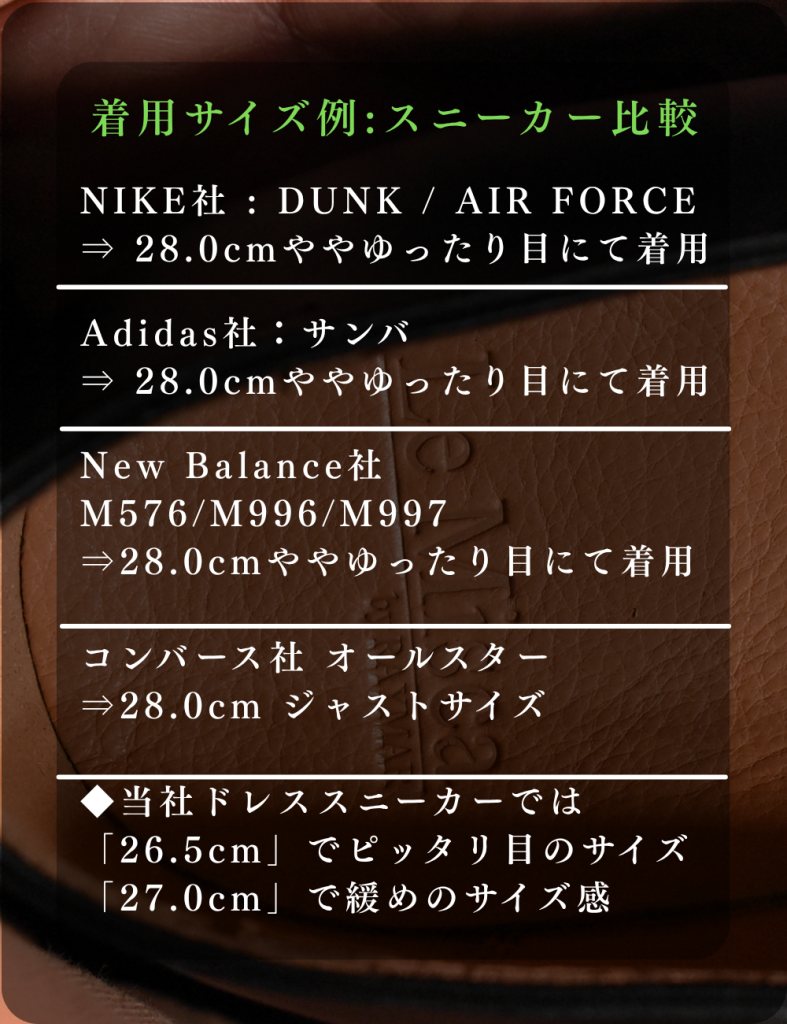 ※上記木型を使用したモデルをタイトフィットで履かれている方は問題御座いませんが、ゆったり履かれている方にとっては大きいサイズとなってしまう可能性が御座いますのでご注意下さいませ。