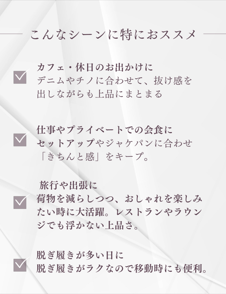 気軽に履ける快適さを実現し、デザインと軽やかな履きやすさを両立したLe Miscaブランド専用の木型となっております。